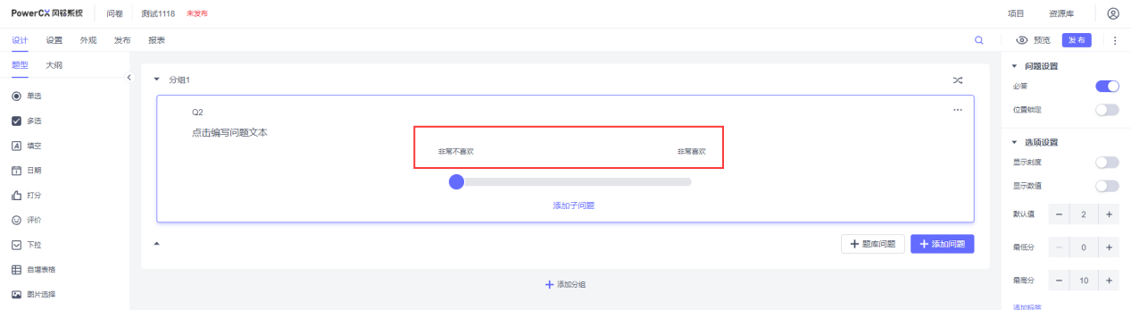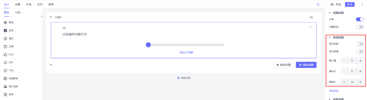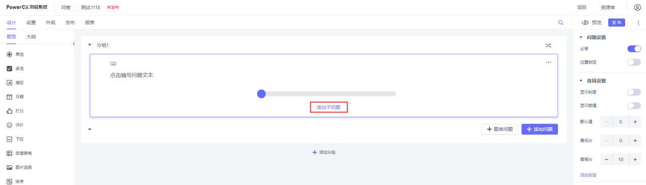 2.滑块支持对多个子问题打分,单击问题下方的“添加子问题”。