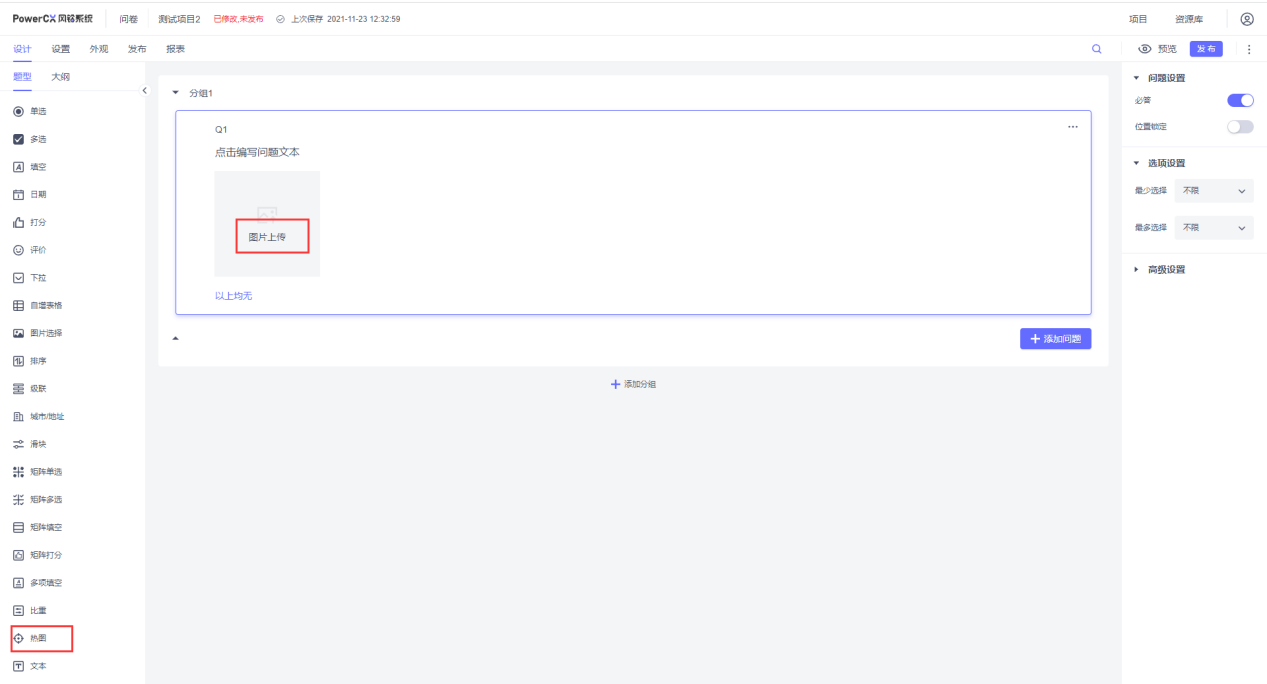 1.点击题型区的【热图】,会自动添加热图题,点击“图片上传”可以上传要使用的图片。