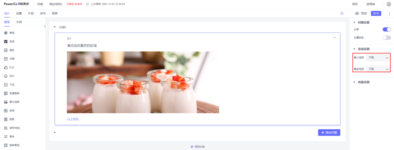 3.在右侧选项设置区,您可以设置受访者最少点击图片的次数和最多点击图片的次数。
