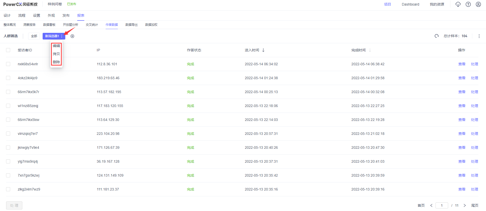 2.在“数据看板”,“交叉统计”,“作答数据”中均可筛选数据。
